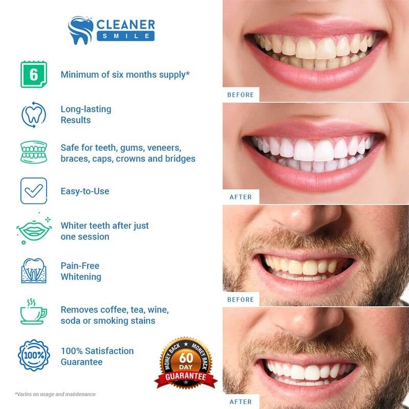 If for any reason you are unsatisfied with the Cleaner Smile LED Teeth Whitening Kit or your results, you can return it to us within 60 days for a full refund or replacement